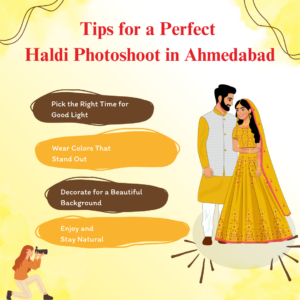 A haldi photoshoot in Ahmedabad is a fun and colorful experience. Because this event is full of joy, planning it well is important. Also, following simple tips will make your pictures look great. Here are five easy tips: